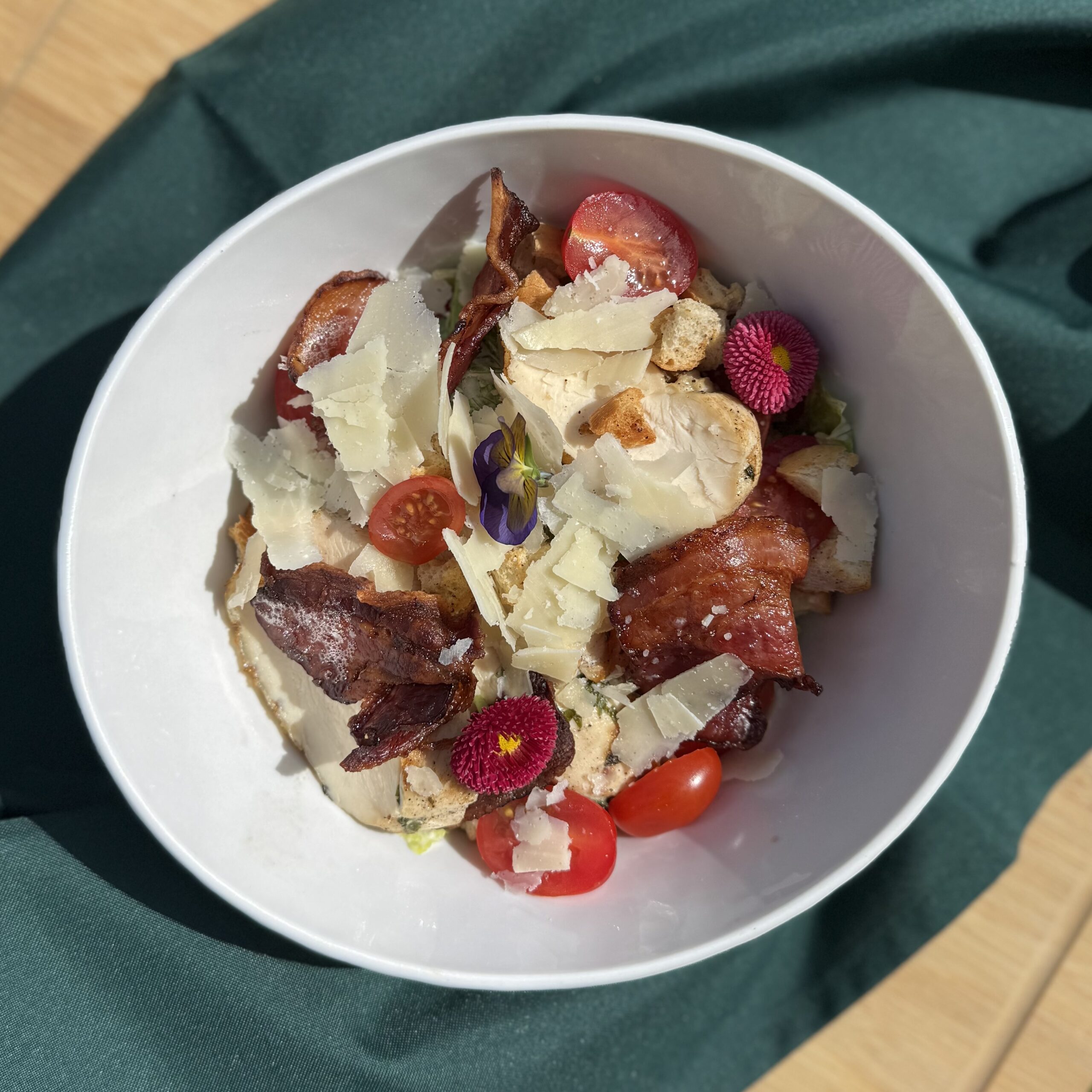 bekon, parmezan,pomidorki cherry, grzanki czosnkowe